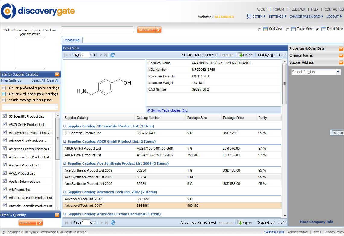 Make informed compound purchasing decisions and cut costs with structure-searchable databases of supplier compound information that include supplier, location, package, purity, and cost information. The SCD (screening compound database) data are now added to the web application of the All New DiscoveryGate. Go to www.discoverygate.com/dg3 and the ACD/SCD application opens. If you have no login information, you still can use it, only, you will not see prices and the shopping cart will not work. You can ask for a free-of-charge evaluation. |